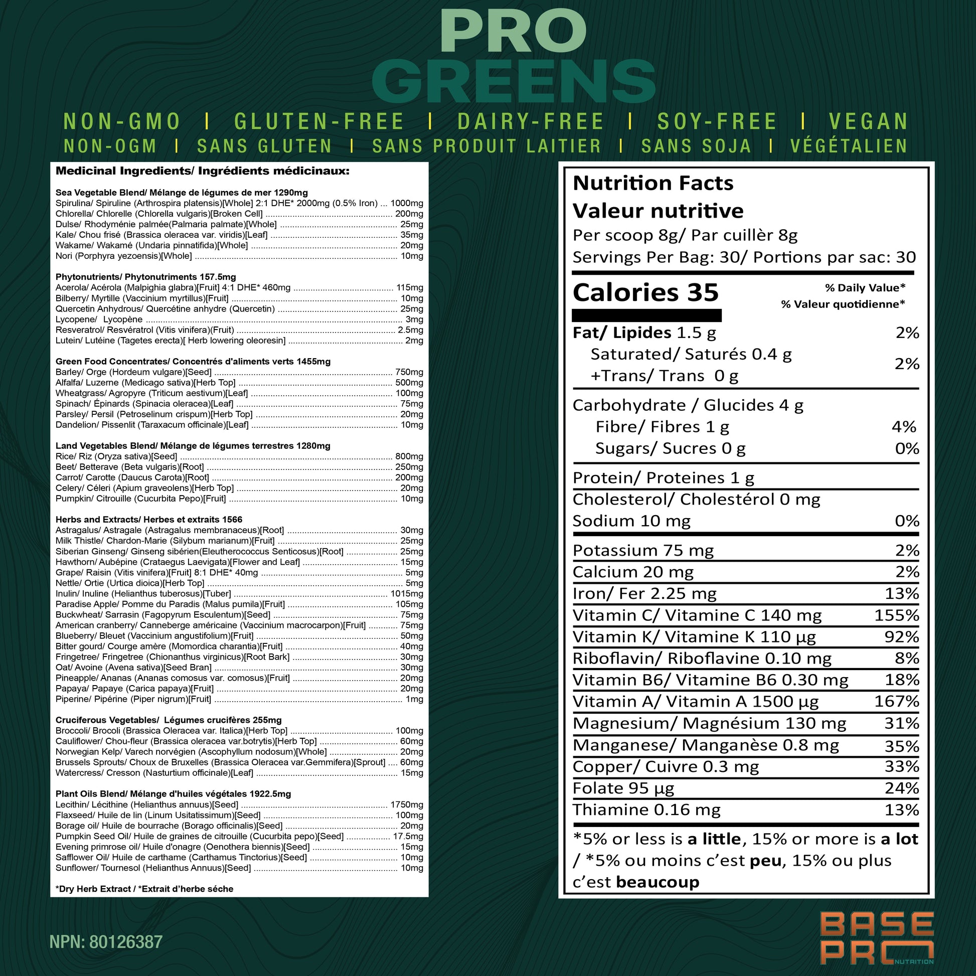 Spirulina/ Spiruline (Arthrospira platensis)[Whole] (2:1 DHE* 2000mg (0.5% Iron))1000mg; Chlorella/ Chlorelle (Chlorella vulgaris)[Broken Cell] 200mg; Dulse/ Rhodyménie palmée(Palmaria palmate)[Whole] 25mg; Kale/ Chou frisé (Brassica oleracea var. viridis)[Leaf] 35mg; Wakame/ Wakamé (Undaria pinnatifida)[Whole] 20mg; Nori (Porphyra yezoensis)[Whole] 10mg; Acerola/ Acérola (Malpighia glabra)([Fruit] 4:1 DHE* 460mg) 115mg; Bilberry/ Myrtille (Vaccinium myrtillus)[Fruit] 10mg; Quercetin Anhydrous/ Quercétine anhydre (Quercetin) 25mg; Lycopene/ Lycopène 3mg; Resveratrol/ Resvératrol (Vitis vinifera)(Fruit) 2.5mg; Lutein/ Lutéine (Tagetes erecta)[ Herb lowering oleoresin] 2mg; Barley/ Orge (Hordeum vulgare)[Seed] 750mg; Alfalfa/ Luzerne (Medicago sativa)[Herb Top] 500mg; Wheatgrass/ Agropyre (Triticum aestivum)[Leaf] 100mg; Spinach/ Épinards (Spinacia oleracea)[Leaf] 75mg; Parsley/ Persil (Petroselinum crispum)[Herb Top] 20mg; Dandelion/ Pissenlit (Taraxacum officinale)[Leaf] 10mg; Rice/ Riz (Oryza sativa)[Seed] 800mg; Beet/ Betterave (Beta vulgaris)[Root] 250mg; Carrot/ Carotte (Daucus Carota)[Root] 200mg; Celery/ Céleri (Apium graveolens)[Herb Top] 20mg; Pumpkin/ Citrouille (Cucurbita Pepo)[Fruit] 10mg; Astragalus/ Astragale (Astragalus membranaceus)[Root] 30mg; Milk Thistle/ Chardon-Marie (Silybum marianum)[Fruit] 25mg; Siberian Ginseng/ Ginseng sibérien(Eleutherococcus Senticosus)[Root] 25mg; Hawthorn/ Aubépine (Crataegus Laevigata)[Flower and Leaf] 15mg; Grape/ Raisin (Vitis vinifera)[Fruit] (8:1 DHE* 40mg) 5mg; Nettle/ Ortie (Urtica dioica)[Herb Top] 5mg; Inulin/ Inuline (Helianthus tuberosus)[Tuber] 1015mg; Paradise Apple/ Pomme du Paradis (Malus pumila)[Fruit] 105mg; Buckwheat/ Sarrasin (Fagopyrum Esculentum)[Seed] 75mg; American cranberry/ Canneberge américaine (Vaccinium macrocarpon)[Fruit] 75mg; Blueberry/ Bleuet (Vaccinium angustifolium)[Fruit] 50mg; Bitter gourd/ Courge amère (Momordica charantia)[Fruit] 40mg; Fringetree/ Fringetree (Chionanthus virginicus)[Root Bark] 30mg; Oat/ Avoine (Avena sativa)[Seed Bran] 30mg; Pineapple/ Ananas (Ananas comosus var. comosus)[Fruit] 20mg; Papaya/ Papaye (Carica papaya)[Fruit] 20mg; Piperine/ Pipérine (Piper nigrum)[Fruit] 1mg; Broccoli/ Brocoli (Brassica Oleracea var. Italica)[Herb Top] 100mg; Cauliflower/ Chou-fleur (Brassica oleracea var.botrytis)[Herb Top] 60mg; Norwegian Kelp/ Varech norvégien (Ascophyllum nodosum)[Whole] 20mg; Brussels Sprouts/ Choux de Bruxelles (Brassica Oleracea var.Gemmifera)[Sprout] 60mg; Watercress/ Cresson (Nasturtium officinale)[Leaf] 15mg; Lecithin/ Lécithine (Helianthus annuus)[Seed] 1750mg; Flaxseed/ Huile de lin (Linum Usitatissimum)[Seed] 100mg; Borage oil/ Huile de bourrache (Borago officinalis)[Seed] 20mg; Pumpkin Seed Oil/ Huile de graines de citrouille (Cucurbita pepo)[Seed] 17.5mg; Evening primrose oil/ Huile d'onagre (Oenothera biennis)[Seed] 15mg; Safflower Oil/ Huile de carthame (Carthamus Tinctorius)[Seed] 10mg; Sunflower/ Tournesol (Helianthus Annuus)[Seed] 10mg;